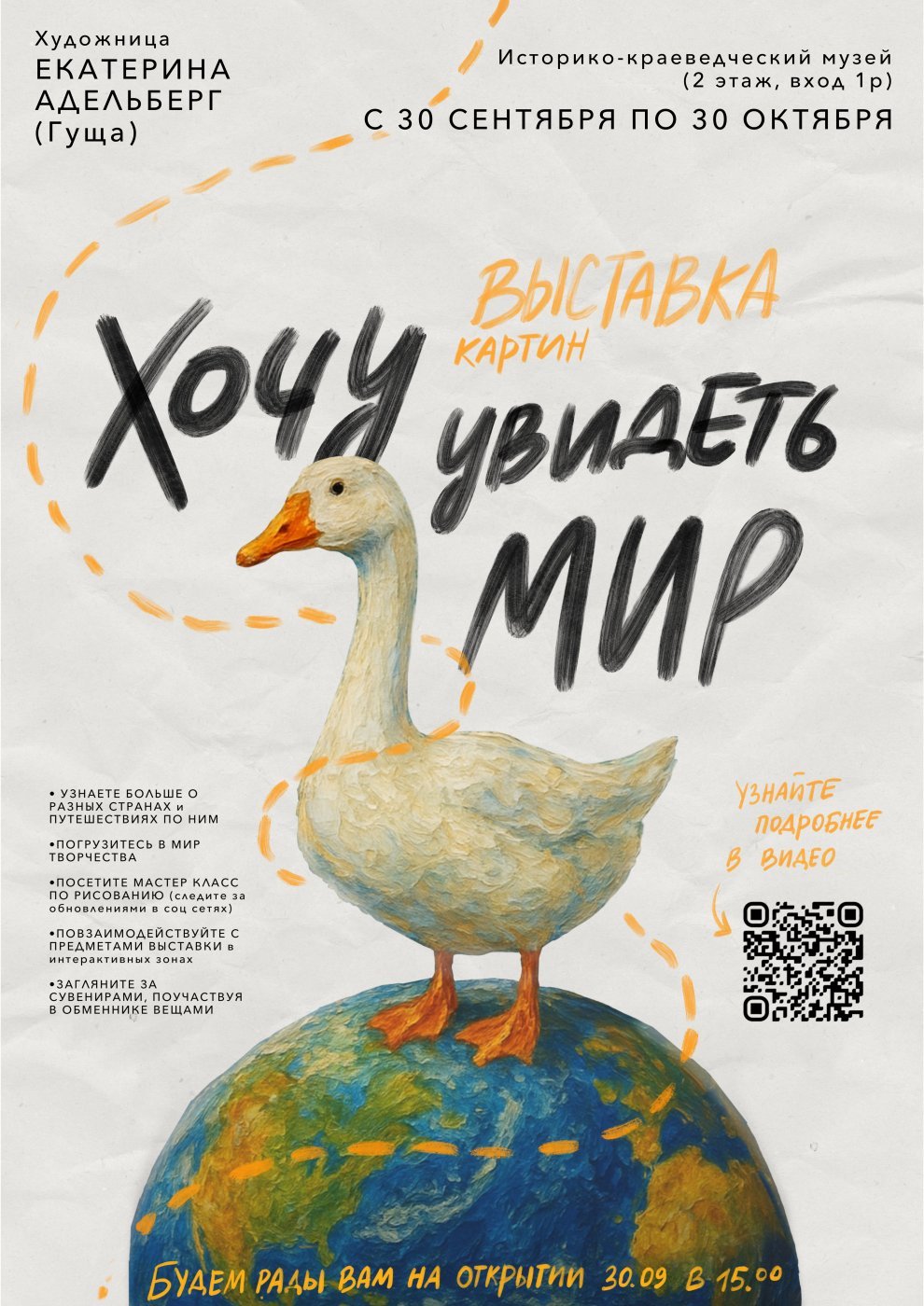 Дорогие друзья! 30 сентября 2025 года состоится открытие художественной выставки «Хочу увидеть мир», художницы Екатерины Адельберг (Гуща). Выставка позволит каждому посетителю погрузится в мир творчества, увидеть и узнать больше о разных странах, повзаимодействовать с предметами выставки в интерактивных зонах и поучаствовать в обменнике вещами.